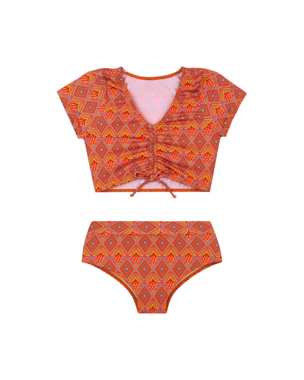 Biquíni Crochê Geométrico L'été: Prepare-se para ser a rainha da praia com este biquíni que é mais estiloso que um gato em um desfile de moda! 🏖️ Com um detalhe de amarração que vai deixar seu corpo ainda mais lindo e uma estampa exclusiva que grita "eu sou única", você vai arrasar! E não se esqueça, ele vem com forro, então pode mergulhar à vontade! ☀️ O biquíni cropped e a manga curta completam o look perfeito para um verão cheio de risadas e selfies! 📸