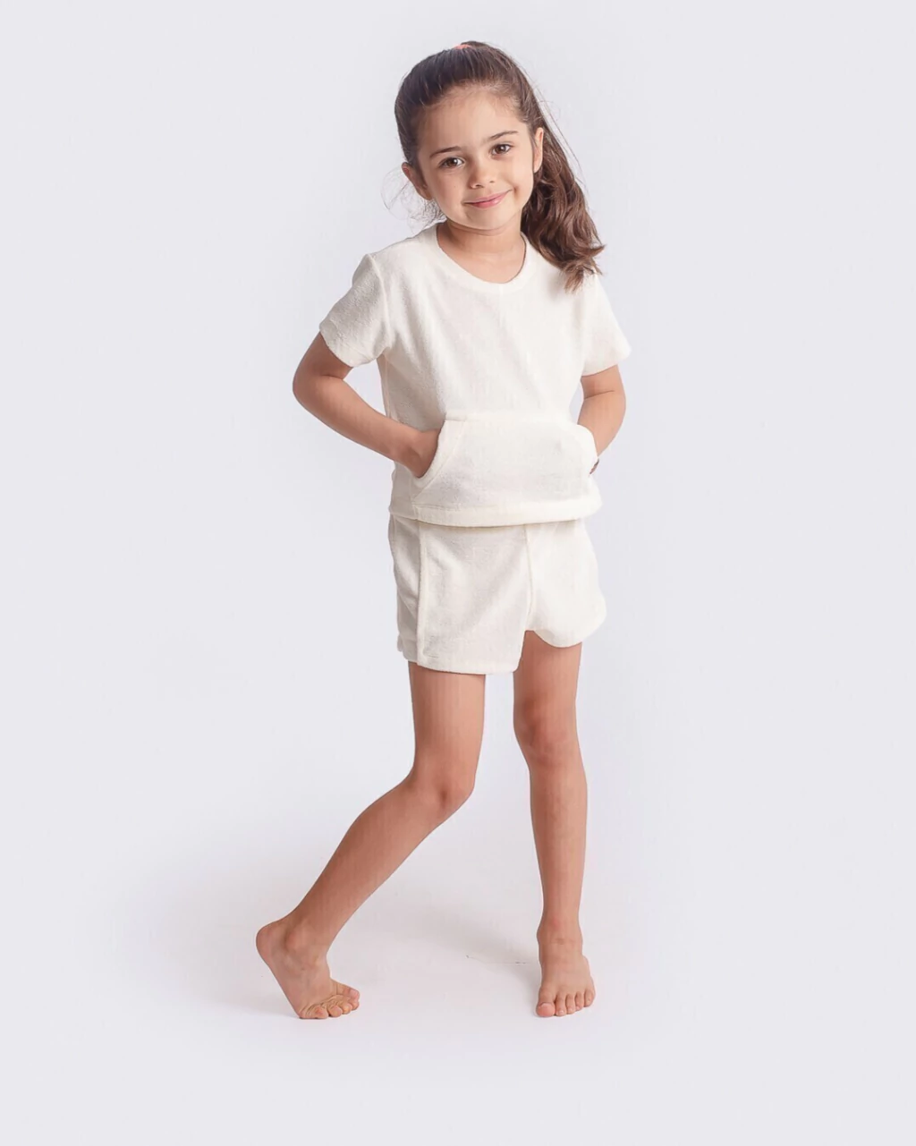 Prepare-se para os dias de sol e diversão com este conjunto superprático e estiloso: Blusa de manga curta com bolso canguru: além de charmosa, é funcional para guardar pequenos itens ou aquecer as mãos. Shorts com cós de elástico: ajusta-se ao corpo com conforto e praticidade. Tecido atoalhado: possui secagem rápida, ideal para brincadeiras na praia, piscina ou após o banho. Versatilidade: pode ser usado como saída de praia ou look casual para o dia a dia.
